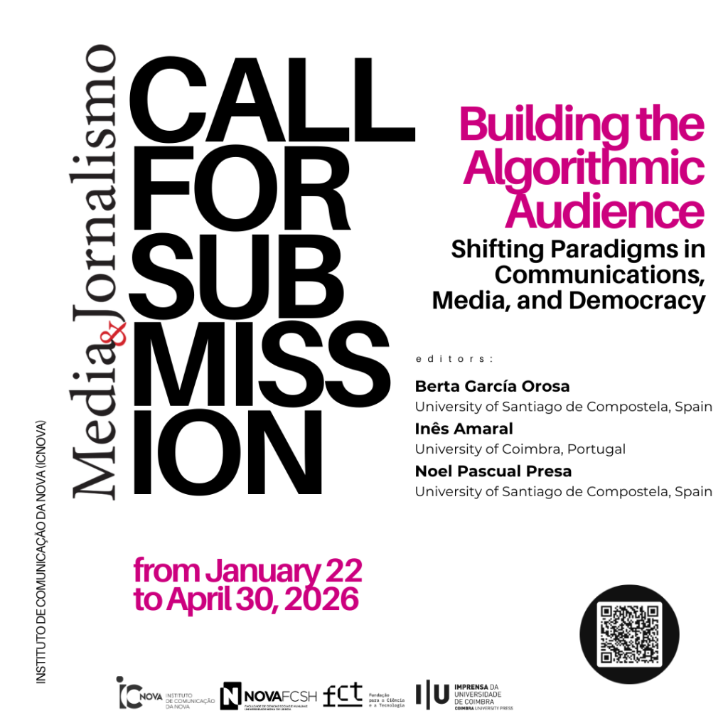 A revista Media & Jornalismo abre uma chamada de artigos para o Vol. 26, Nº 49 (2026), dedicada ao dossiê “Construir a Audiência Algorítmica”,