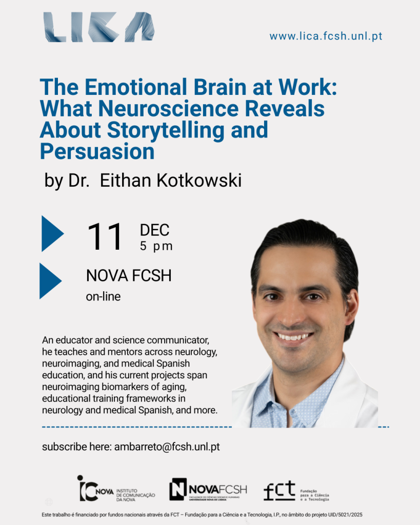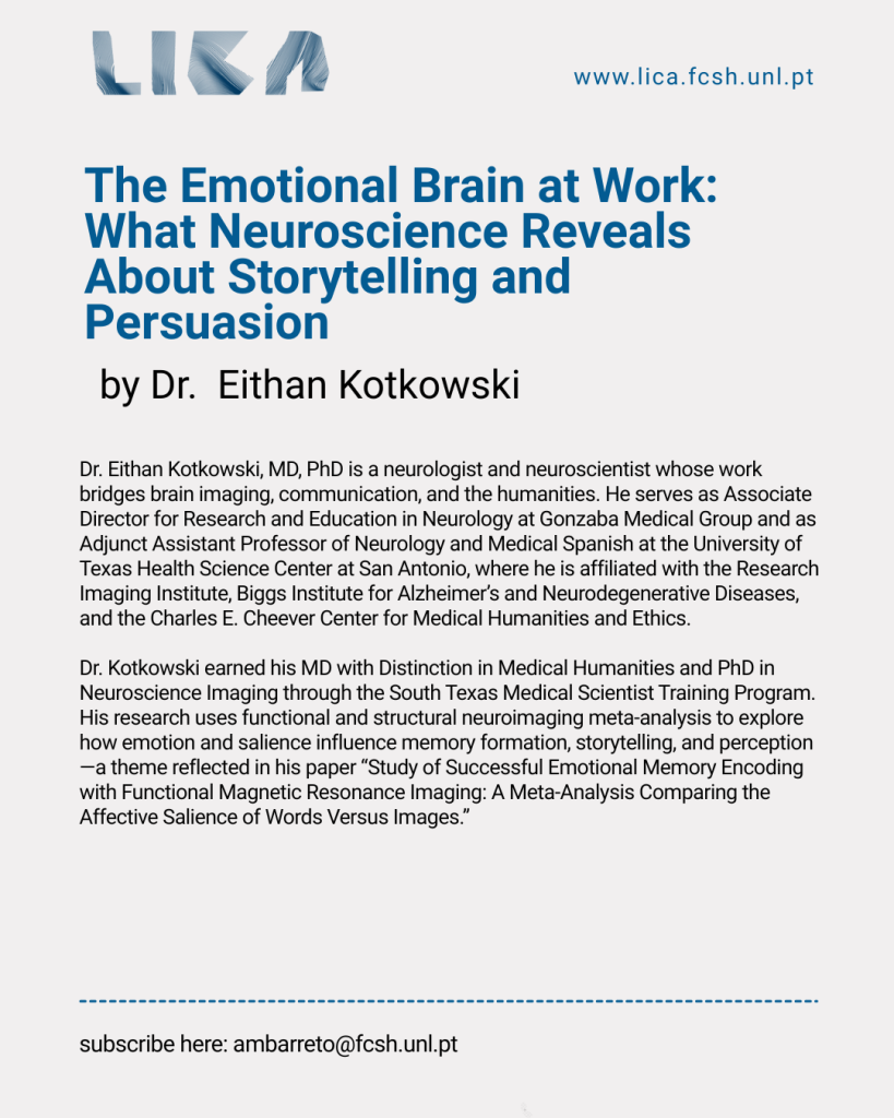 O Laboratório de Investigação em Comunicação Aplicada (LICA) do ICNOVA convida o neurologista e neurocientista Dr. Eithan Kotkowski para uma Invited Talk dedicada à relação entre emoção, memória e narrativa — explorando o que a neurociência nos revela sobre o poder da comunicação e da persuasão.