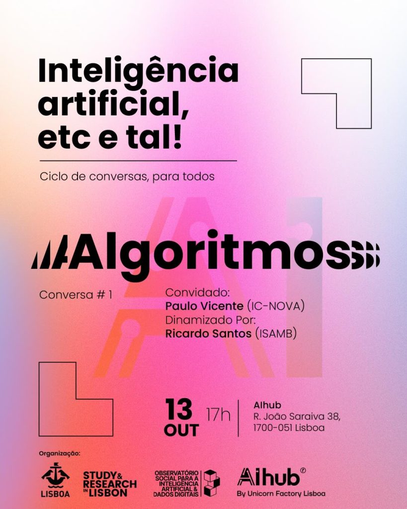 O ciclo de conversas “Inteligência artificial etc e tal”é promovido pelo projecto Study & Research in Lisbon, da Câmara Municipal de Lisboa, em parceria com o Observatório para a Inteligência Artificial & Dados Digitais, do Instituto de Comunicação da FCSH NOVA, e com o AIhub by Unicorn Factory Lisboa.