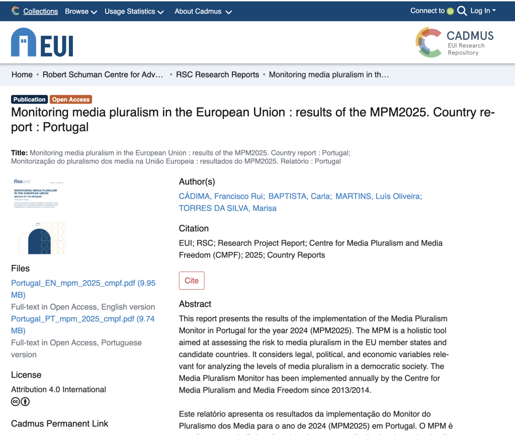 O Media Pluralism Monitor (MPM) é uma ferramenta de investigação apoiada União Europeia e implementada pelo CMPF (Centre for Media Pluralism and Media Freedom) do Instituto Universitário Europeu de Florença. É objetivo deste projeto, iniciado em 2015, avaliar os riscos para o pluralismo dos meios de comunicação social nos Estados-Membros e países candidatos à União Europeia. Através de um conjunto de indicadores e variáveis, o MPM analisa aspetos como a proteção fundamental, a pluralidade do mercado mediático, a independência política e a inclusão social, oferecendo um panorama global do risco para o pluralismo nos diferentes ecossistemas mediáticos europeus e fornecendo dados para a Comissão Europeia. O coordenador geral do MPM é o Prof. Pier Luigi Parcu, Diretor do CMPF.